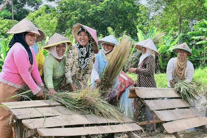 “Sementara di tahap panen, tidak hanya memotong padi, para perempuan juga terlibat saat proses pemisahan antara gabah dan jerami. Tak hanya itu, dalam tahap pasca panen, para perempuan juga ikut menjemur atau mengeringkan padi, bahkan para perempuan juga terlibat saat menjual hasil panen,” tulis peneliti.