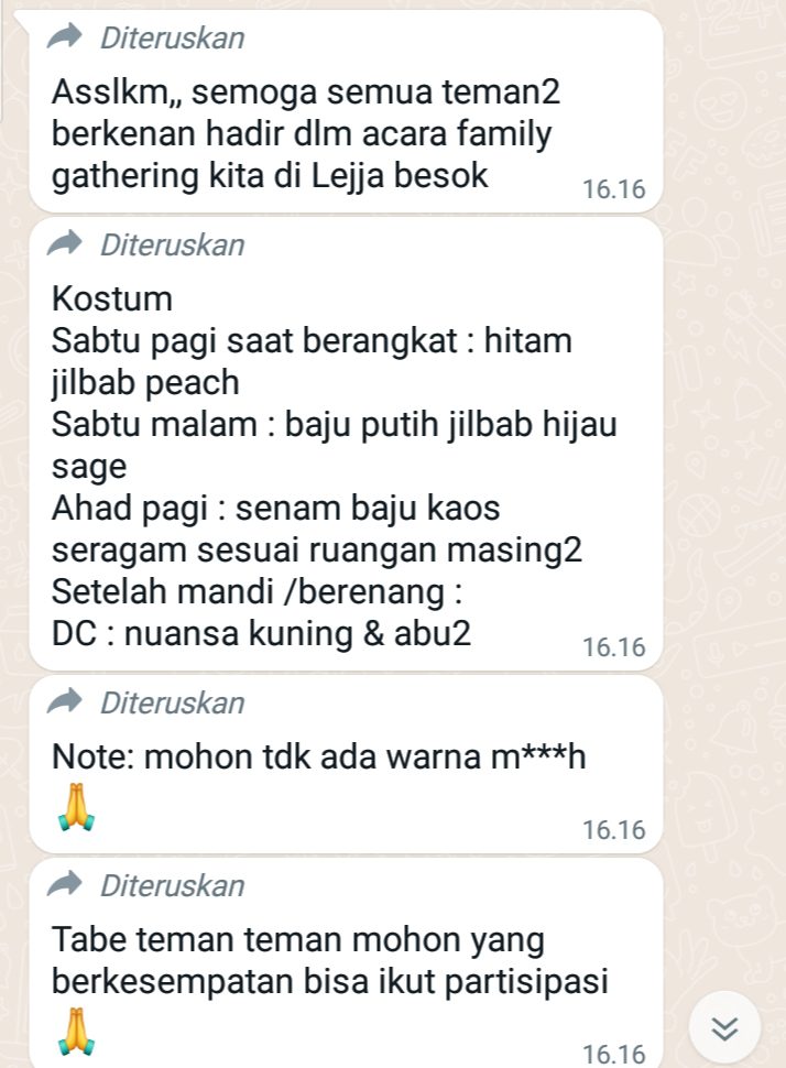 “Asslkm,, semoga semua teman2 berkenan hadir dlm acara family gathering kita di Lejja besok. Kostum Sabtu pagi saat berangkat : hitam jilbab peach, Sabtu malam : baju putih jilbab hijau sage, Ahad pagi : senam baju kaos seragam sesuai ruangan masing2, Setelah mandi /berenang : DC : nuansa kuning & abu2,”