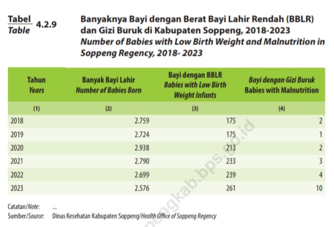 Sebagai perbandingan, tahun 2022 ada sebanyak 2.699 bayi lahir di Kabupaten Soppeng, dari jumlah tersebut sebanyak 238 bayi mengalami BBLR.