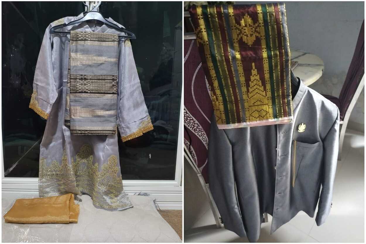 Sedangkan untuk perempuan, terdiri dari baju bodo berwarna grey atau abu-abu dengan bordir payet lengkap dengan kain sarung tenun dan jilbab.