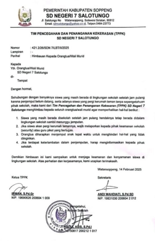 “Orang tua diharapkan menjemput anak tepat waktu untuk menghindari hal-hal yang tidak diinginkan,” isi surat imbauan yang ditandatangani oleh Ketua TPPK SDN 7 Salotungo, Irwan tertanggal 14 Februari 2025 tersebut.