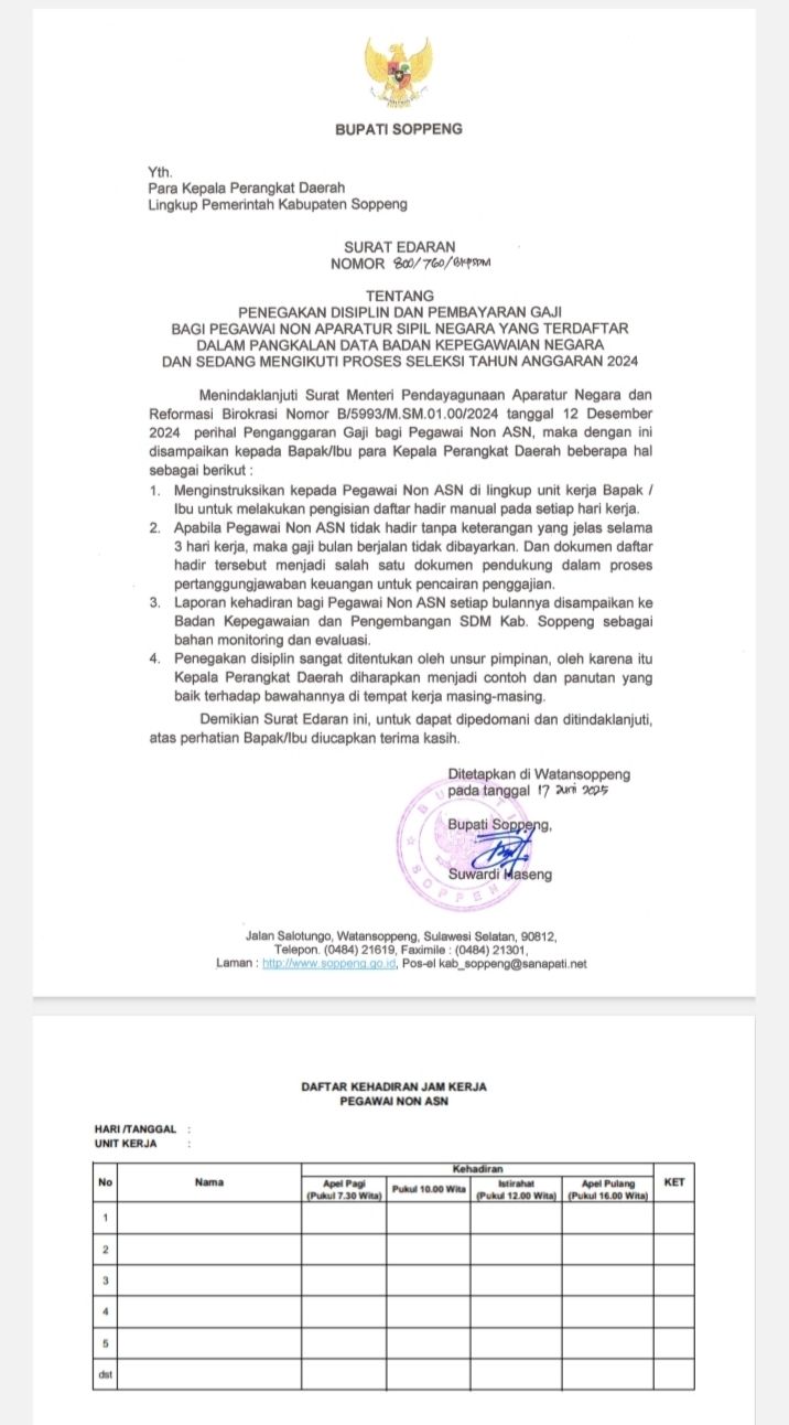 Aturan ini tertuang dalam surat edaran Bupati Soppeng nomor 800/760/BKPSDM tertanggal 17 Juni 2025.