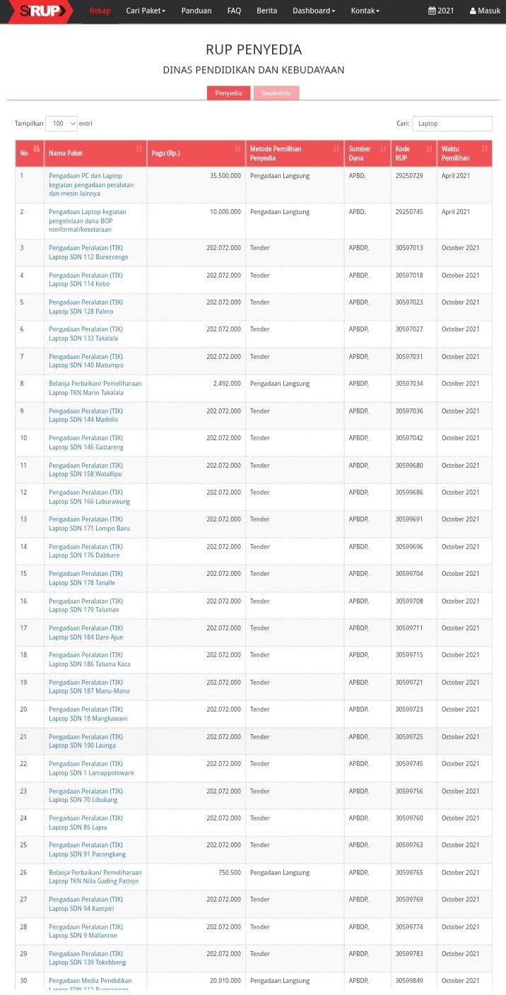 Hal ini bisa dilihat di laman Sistem Informasi Rencana Umum Pengadaan Lembaga Kebijakan Pengadaan Barang/Jasa Pemerintah (SIRUP LKPP) milik Disdikbud Kabupaten Soppeng.