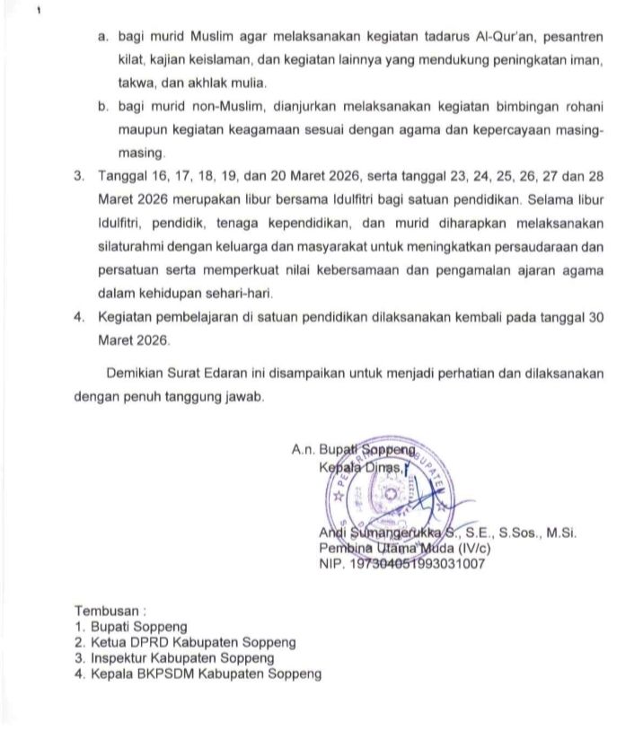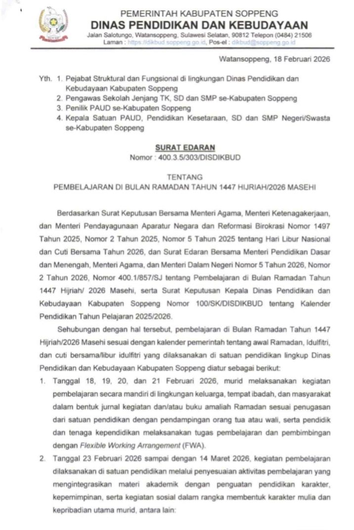 Hal ini tercantum dalam Surat Edaran Nomor 400.3.5/303/DISDIKBUD tertanggal 18 Februari 2026 yang ditandatangani oleh Kepala Disdikbud Kabupaten Soppeng, Andi Sumangerukka.