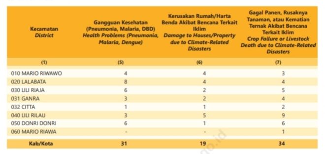 Secara keseluruhan, dampak perubahan iklim di Kabupaten Soppeng juga mencakup kerusakan rumah atau harta benda di 19 desa/kelurahan, serta kehilangan mata pencaharian yang bergantung pada alam di 9 desa/kelurahan.
